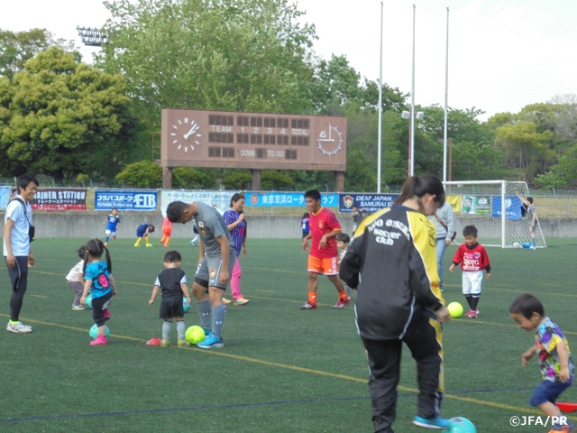 2日目の午後からは、恒例のデフキッズサッカーイベントが行われました。小学校高学年・低学年・幼児の3組に分かれ、52名の子ども達が、参加チームの選手やデフ日本代表選手らとともに約2時間、サッカーを楽しみました。