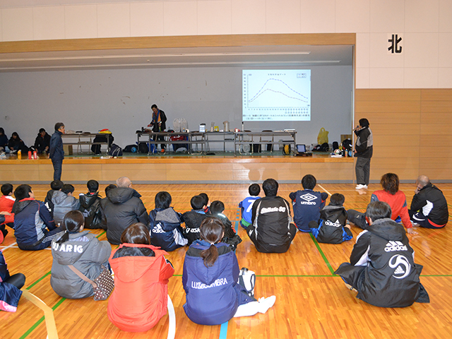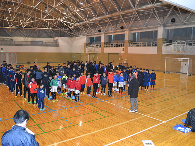 下越地区4種のチーム中心に声掛け、チラシ配りを行いまして12チームが集まりました。インフルエンザの流行や他の大会、イベントと重なり出たくても出れなかったチームが多数あり、昨年より参加者が減ったのは寂しい限りでしたがピッチ内は熱い戦いが繰り広げられていました。昼休憩時間には、地元の接骨院の先生からストレッチ、運動中の給水方法などの講演をして頂き、参加者から大変好評でした。