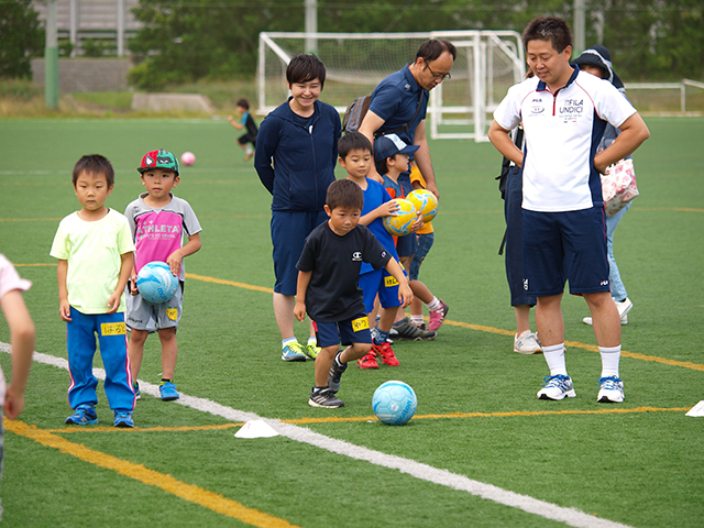 当日は雨が予測されたが天気に恵まれ、人工芝の上で笑顔がたくさん見られた。キッズ委員会やチーム指導者、高校生にも協力をいただき開催することができました。