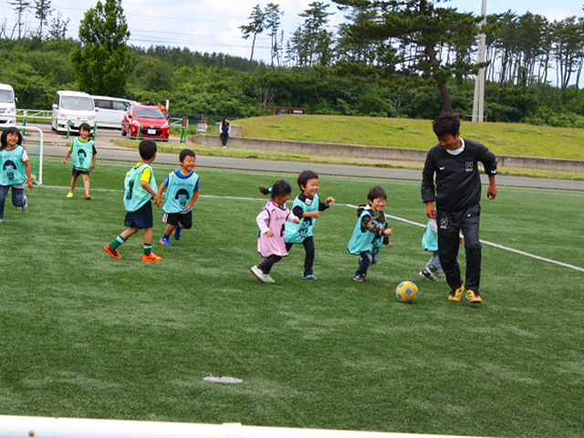 心配していた天気予報の雨も曇ってこそいましたが降らずに無事開催することができました。コーチが鬼になってのオニゴッコからスタートし直ぐに初めての子供たちとも打ち解けよい笑顔をいただきました。アトラクション形式の動きづくりでは皆一生懸命に取り組んでいました。最後はゲームで締めくくり、楽しい時間はあっという間に過ぎてしまいました。これをきっかけにサッカーファミリーが増えてくれると嬉しいです。