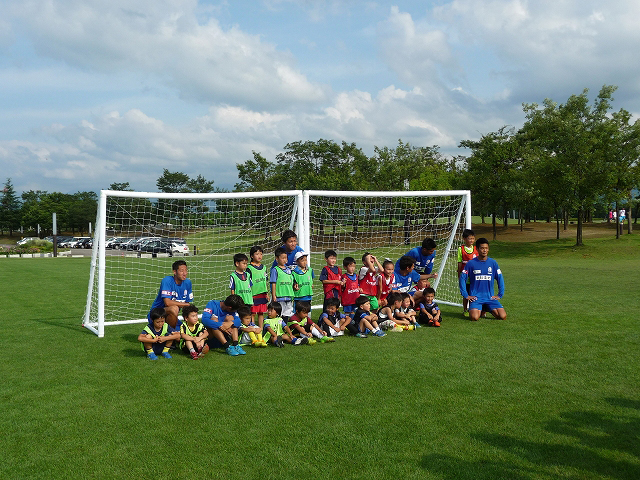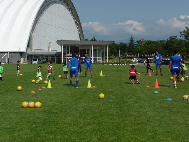 地元のプロサッカークラブ・カターレ富山の選手(6名)やスタッフと、21名の子ども達が元気にボールを追いかけて走り回っていました。ゲーム形式だけでなく、グラスルーツ方式でボールを使った遊びなど、たくさんボールと触れ合う事ができました。