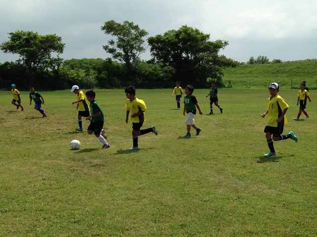 今日は暑くて大変だったけど、ゲームがいっぱい出来て楽しかった。違うチームの人と同じチームになってゲームしたから思い通りにはパスは繋がらなかったけど、いっぱい笑えて楽しかった。