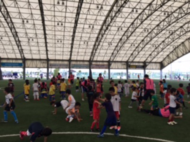 J-GREEN堺の屋根付きフットサルコート3面を使用し、開催した今回のJFAキッズフェスティバルでは、参加者の活動時の現象への気づきにより早く反応し、その場面において、運営スタッフがより質の高い関わりをする力を磨いていく為に、参加カテゴリーをいつものU-6/U-8からU-7/U-10へ変更して、その募集運営を行った。結果、事前の打ち合わせより、スタッフ間に良い緊張感が生まれ、各参加者への細かな意識と声掛けが増えたように思った。また、参加者の笑顔もいつもより多かったように感じた活気あるキッズフェスティバルであった。
