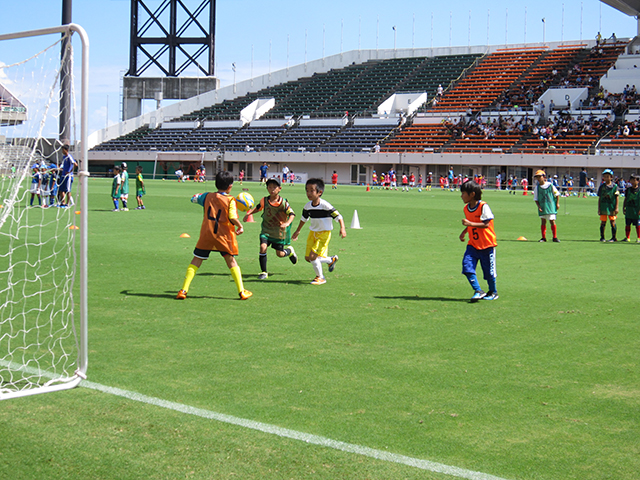 私達家族は、エスパルスが大好きで日本平スタジアムにはよく行きます。その馴染みのある日本一のピッチで自分の子供がサッカーをする事が出来て嬉しく思います。子供も、いつも客席から見ているスタジアムのピッチで練習できたことはすごく嬉しかったと話していました。特に友達と一緒に参加した訳ではないのですが他のチームの友達がすぐできたようで、楽しかったようです。補助についてくれた高校生のお兄さんが優しくて憧れ?にもなったようです。内容も短時間のローテーションで色々なトレーニングが出来て子供達には新鮮で刺激になったと思います。たまたま当日は日差しが強く熱中症の心配もあったので出来れば秋開催であればなと思いました。日程面の調整は難しいと思いますが、地区の運動会と重なり行けなくて残念と話している人もいました。