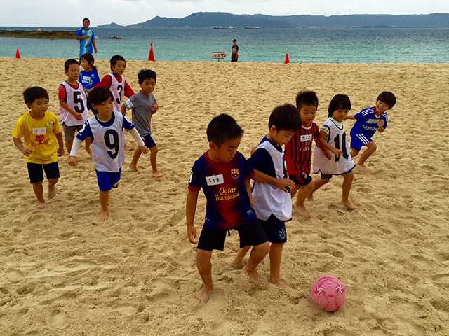 昨年に続き、今年もソーマプライア沖縄の選手によるビーチサッカースクール、ゲームのフェスティバルを開催し、総勢105名の子供達が参加してくれました。普段サッカーをしている子も砂の上でのボールコントロール、シュートに苦戦していましたが、ソーマプライア沖縄の選手による指導ですぐマスターし笑顔のあるスクール、ゲームとなりました。ボールを初めて蹴る子達も仲間と一緒にボールを蹴ることで笑顔になり砂まみれで笑っていました。