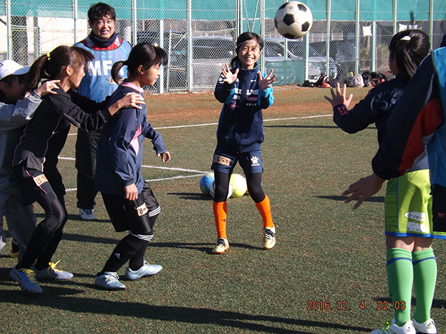 小学生1年~6年生の女の子が集まり、ガールズサッカーフェスティバルを開催しました。普段スポーツ少年団で男子に混ざり活動していますが、今日は女の子だけでの活動。ドリブルもシュートも一生懸命練習しました。ゴールに入り喜ぶ声、アハハと笑う声、保護者の声援など、12月では珍しく晴天で暖かな日は、女の子達の笑顔あふれる1日となりました。