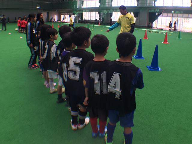 年代別に3つのカテゴリーに分かれ、4種類のメニューを体験し、最後にはゲームをし楽しんでいました。4歳~5歳の子達には寝転がったり、バーをくぐったり、飛び跳ねたり、普段ボールを蹴ることがない子供達もわかりやすく教えてくれる高校生のお姉ちゃんと楽しんで笑顔になっていました。
