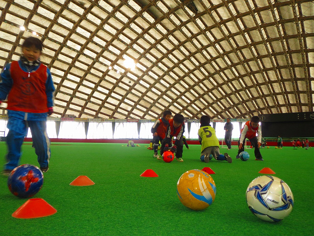 開催場所は天気の心配がいらない世界最大級の木造ドーム。たくさんの雪で外ではサッカーが出来ない時期ですが、人工芝のドーム内で元気にボールを追いかけました。U-6では親子でのコーン倒し対決も行われ、本気を出した保護者に負けた子供たちは悔しがっていました。サッカーを続けてくれる子供が少しでも増えてくれることを期待したいです。