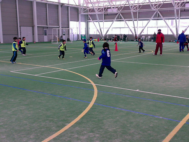 今回初めて屋内運動場を利用して、フェスティバルを開催しました。雪の影響で野外ではボールを使うことが出来ない為、広いピッチで久しぶりにサッカーをすることができた子ども達は、本当にうれしそうに取り組んでいました。U8では、リフティングを行い股関節の準備運動も兼ねてアップをしました。インサイドやアウトサイドでリフティングをすることが普段はない子が多く、一生懸命チャレンジしている姿が印象的でした。初めて参加している子には、コーチが積極的に声を掛け、行うことが出来ました。