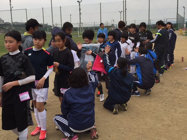 お天気もよく、朝早くからたくさんのお友達が集まってくれました。普段は男子と一緒にサッカーをしているお友達がほとんどですが、この日は同じ年代のたくさんの女子が集まり、グランドも華やかです。4種委員会、女子委員会のスタッフに加え、女子中高生のお姉さん達もスタッフとして参加してくれました。ほとんどの中高生が、かつてこのガールズフェスティバルに参加しています。中高生も童心に戻り、小学生たちとサッカーを楽しみました。小学生たちも、お姉さんのように上手にやりたいと一生懸命です。最後にはスタッフが花道を作り、ハイタッチをしてお別れしました。参加者、スタッフの皆さん、笑顔いっぱいの一日でした。