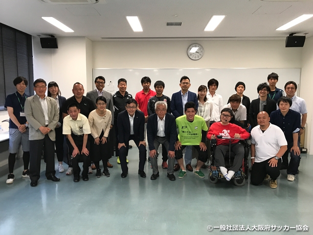 一般社団法人大阪府サッカー協会主催による「2017年度第1回大阪府障がい者サッカーミーティング」が6月10日(土)、J-GREEN堺で開催されました。このミーティングは、大阪府内の障がい者サッカーの普及・発展に向け、地域に即した形で各団体と連携を深めることを目的とし、一般社団法人関西サッカー協会や大阪府内の障がい者サッカー団体の代表者なども含め、26人が出席しました。また、オブザーバーとして、日本障がい者サッカー連盟(JIFF)専務理事兼事務総長を務める松田薫二JFAグラスルーツ推進部部長が出席しました。