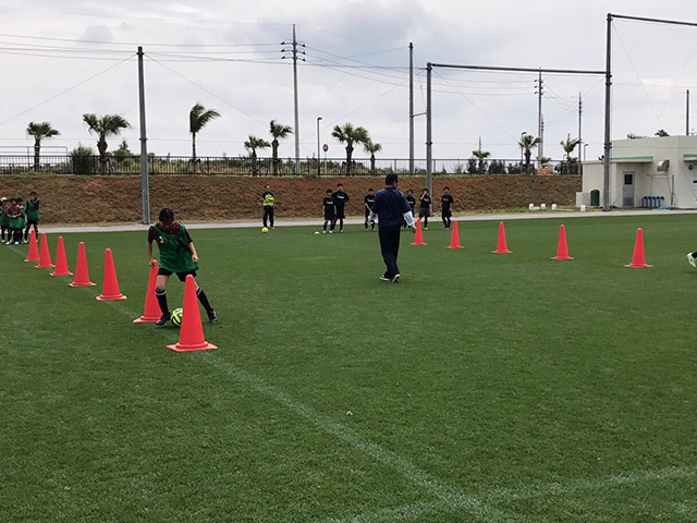沖縄県内の中学生選手を中心に12チーム参加。フェスティバルは午前にグラスルーツ形式でメニューをこなし午後はゲーム形式で行いました。今回のフェスティバルは初めて参加するという選手が多くはじめは緊張した選手が多かったのですが徐々に緊張が解け他チームの選手とコミュニケーションを取りながらプレーしていました。