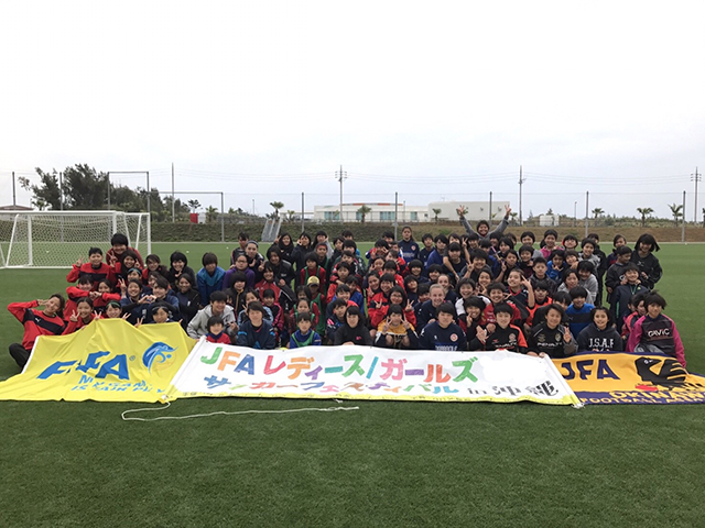 2017年3月26日(日)に沖縄県国頭郡にある「金武町フットボールセンター」にて197名が参加し、JFAレディース/ガールズサッカーフェスティバルを行いました。
