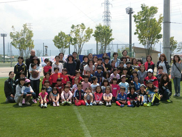 今年度初めてのハッピーサッカー。内容的には親子でのメニューを多く取り入れ、親子で向かい合っての『タッチ・タッチ・タッチ』、また体全体で表現する『じゃんけん』で親子の触れあいを楽しみました。そのあとはボールを使ったサーキット(ドリブル・キック・シュート)を行い、最後にはゲームをして参加者全員で楽しみました。