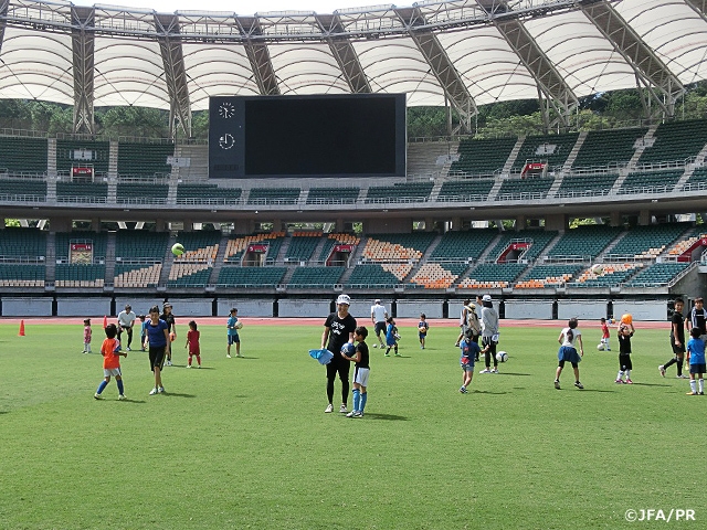静岡県では、9月2日(土)にエコパスタジアムに110人が参加し、元サッカー日本代表で現在U-17日本代表コーチを務める齊藤俊秀さんや、元Jリーガーの石田博行さんらが講師となり、遊びの要素も取り入れたリフティングやドリブルの競い合い、複数のボールを使ってのミニゲームなどを行いました。子どもと大人が一緒になって参加し、暖かい日差しのもと、芝生の上を元気に動き回っていました。