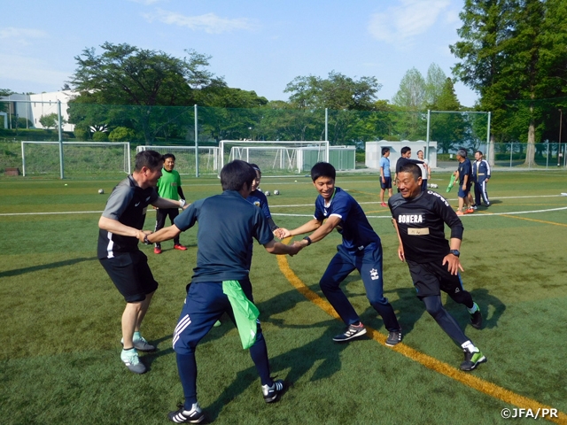 キッズプログラム活動の3本柱の1つである「巡回指導」をテーマにした研修会でした。巡回指導は各都道府県サッカー協会(47FA)が幼稚園、保育園、小学校などに指導者を派遣し、子どもたちにサッカーの楽しさや身体を動かすことの楽しさを教える活動です。サッカーをする子供たちを増やしていくためにはとても重要な事業だと考えています。47FA巡回指導者責任者が集まり、直接子どもたちと接する指導者がサッカーの楽しさを感じてもらうためにはどう伝えていくのがいいのか?どうオーガナイズしていくのか?をグループディスカッションと2回の指導実践を通じて確認しました。また本研修の内容を参加者が持ち帰り、県内で巡回を担当する指導者に伝達していただくことを強くお願いしました。サッカーと出会う最初の指導者としての立ち居振る舞いは、とても重要だと考えます。各FAで関わっているそれぞれの園において、子どもたちが笑顔で夢中になれる雰囲気を作り出せるよう願っています。2日間とも素晴らしい天気のもとで参加者が積極的に取り組んでくださり、充実した研修会となりました。これからのFAでの巡回指導の発展を期待するとともに、我々も各FAのサポートをしていきたいと考えています。