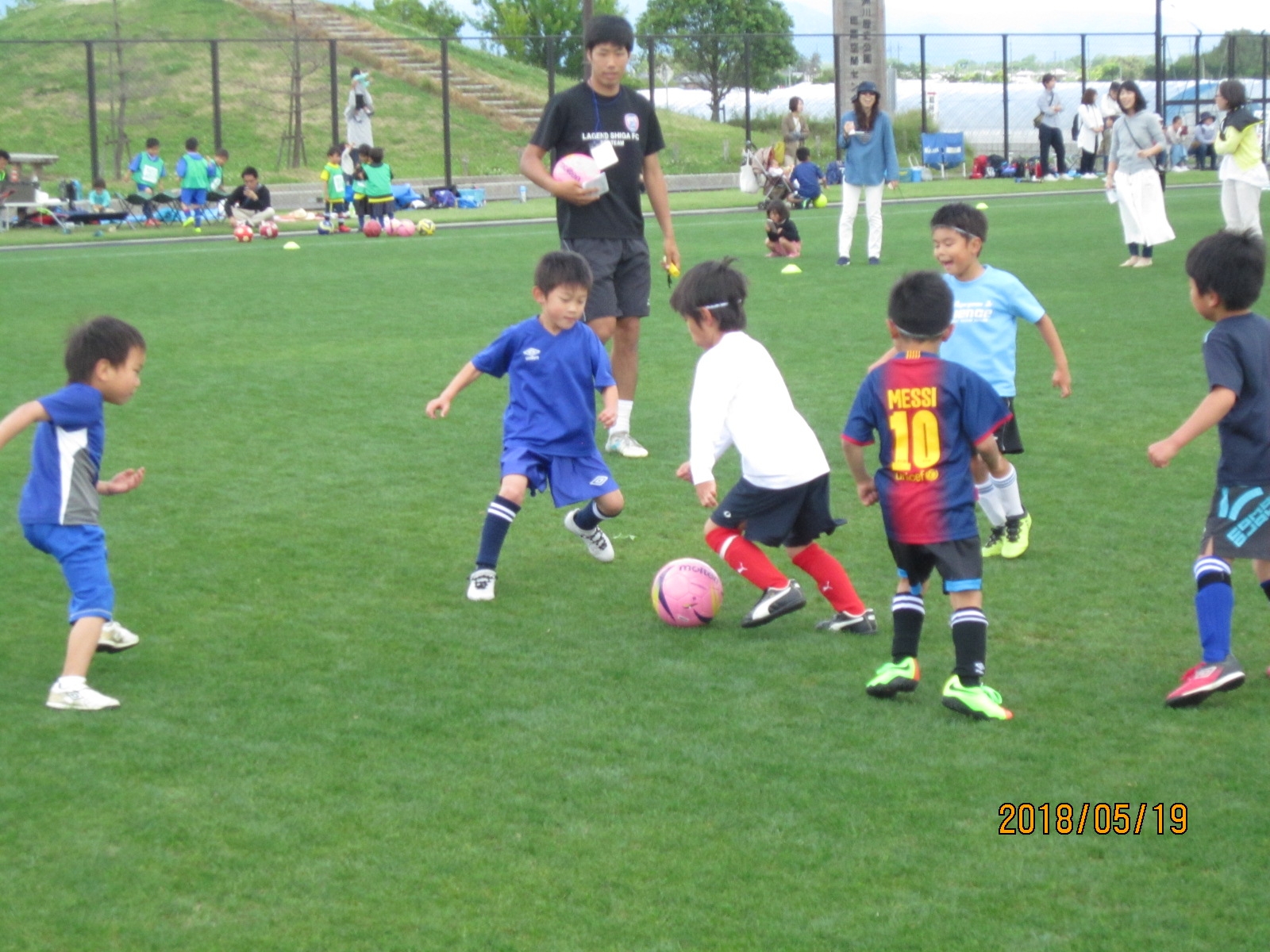 JFAキッズ(U-10)サッカーフェスティバルは、サッカーが好きな10歳以下の子どもであれば、だれでも参加できる楽しいフェスティバルです。2018年05月19日(土)に滋賀県守山市にある「野洲川歴史公園サッカー場「ヒビッグレイク」」にて189人が参加しました。