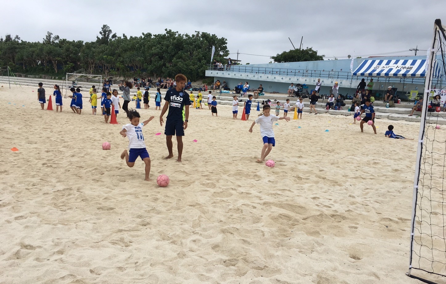 | 担当者のコメント | 今回4回目の開催となったビーチサッカーフェスティバルでは、100名近くの参加があり、砂の上でのサッカーを皆が存分に楽しみました。沖縄県のビーチサッカーチーム『ソーマプライア』のビーチサッカークリニックを行い、その後選手も一緒に子どもたちとゲームを楽しみました。今回はブラジリアンサッカークラブの子どもたちも多数参加し、国際交流の一面も見れたフェスティバルとなりました。 |