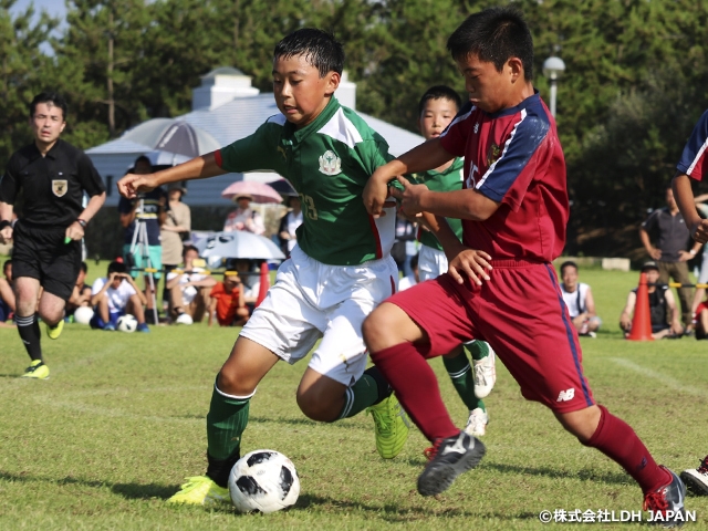 各コートで声援が飛び交う熱戦を勝ち抜いてファイナルへ駒を進めたのは、センアーノ神戸ジュニアと京都長岡京SSG U12(京都府)です。お互いに前線からプレッシャーをかけあう中で、コンビネーションや一瞬の隙を付いてシュートまで持ち込みますが、両チームのGKの好守もあって得点が生まれず、今大会初の決勝延長戦となりました。センアーノ神戸ジュニアのミドルシュートが相手選手に当たって先制点を奪うと、その1分後にも再びミドルシュートを野田凰心くんが頭で押し込んで、2-0で勝利しました。