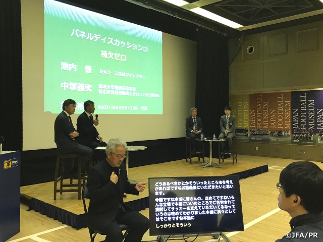 パネラー:中塚義実(筑波大学附属高等学校、特定非営利活動法人サロン2002/理事長)、鈴木裕大(KAZU SOCCER CLUB/代表)、池内豊(JFAユース育成ダイレクター)