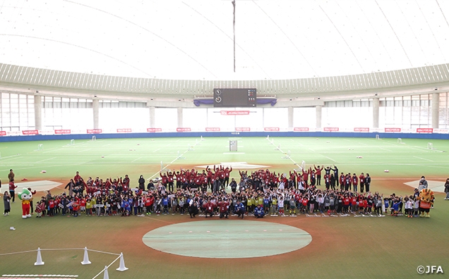 12月15日(日)に、山口県山口きらら博記念公園多目的ドームでJFAユニクロサッカーキッズを開催しました。当日は、ゲストにレノファ山口FCの吉滿大介選手と清永丈瑠選手に参加して頂き、子供たちと一緒にサッカーを楽しみました。また、開会式前にはフリースタイルフットボーラーのろばーとさんによるパフォーマンス披露が行われ、会場を盛り上げてくれました。JFAユニクロサッカーキッズは、6歳以下の未就学児を対象としたサッカーフェスティバルで、2019年度は全国15会場で開催を予定しています。
