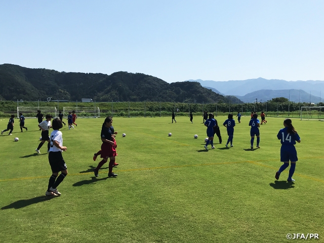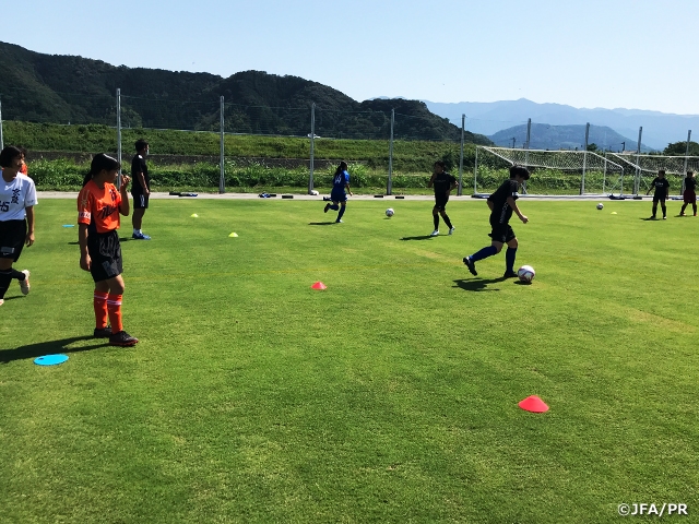 はじめにアイスブレイク~W-upでパス&コントロール・テクニックを意識したトレーニングを行いました。選手たちにレベルの差はあるものの、みんながコーチから要求されていることに耳を傾け、積極的にチャレンジする姿が見受けられました。シャッフルゲームでは、他県のチームの選手や県内でもそれぞれ活動チームが異なる選手たちが次第に自分たちでコミュニケーションを取り、予想以上のゲームを展開していました。普段中学校の部活で男子と共に活動している選手たちにとって女子同士の活動は自然に笑顔が溢れ、楽しみながらプレーしており、その姿を見ていると活動の大切さを再認識する機会となりました。さらにはプレーの質が高くトレセンに参加しても遜色ない選手まで発見することができ、各FAや中体連との連携がさらに必要だと感じました。
