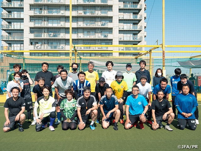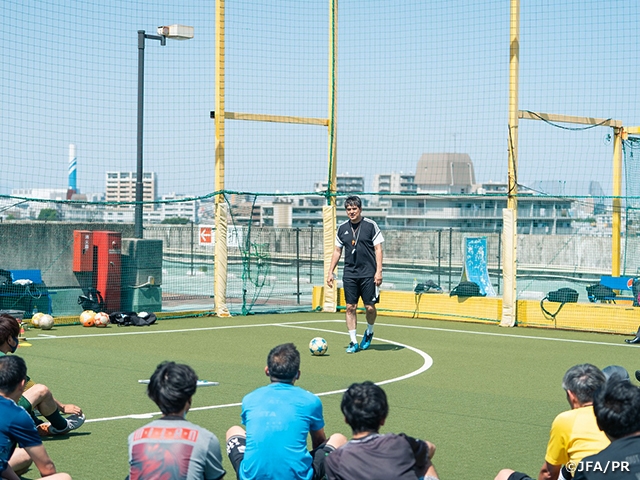 元サッカー日本代表の永島昭浩さんが講師となり、埼玉県川口市のFUT MESSE川口元郷で5月29日(日)、大人を対象としたJFAシニアサッカークリニックを開催しました。この回がJFAシニアサッカークリニックの初開催でしたが、27名(内女性4名)の方が参加し、晴天の中、トレーニングとゲームを2時間楽しみました。