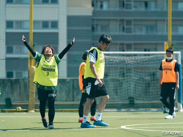 Jリーグの1997年シーズンに日本人単独トップの22ゴールを挙げたストライカーの永島さんは、ストライカー目線での思考や動き方を熱く語りながらも、笑いを誘う絶妙なトークで場を盛り上げ、参加者は終始笑顔でプレーしていました。