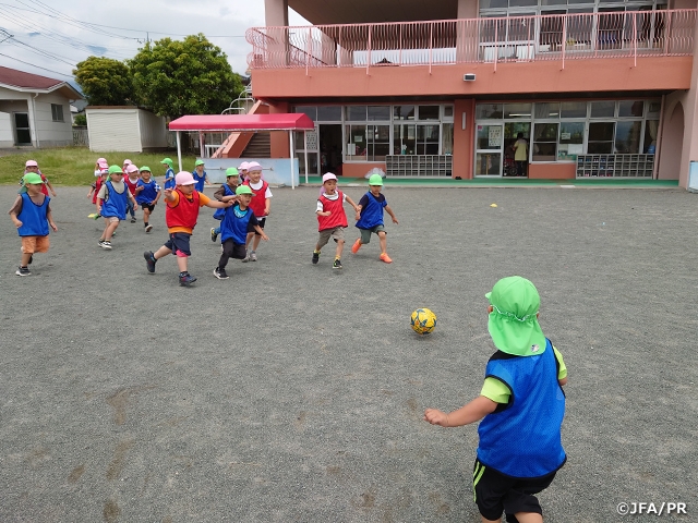 「巡回指導」では、各都道府県協会の巡回指導員が幼稚園や保育園、小学校に出向き、子どもたちにサッカーを楽しんでもらう各種プログラムを提供しています。サッカーの経験や知識があまりなく、なかなか自信を持って教えることができない保育士の皆さんや先生方に、サッカーの指導を専門とするスタッフが加わって、子どもたちがボールを使って体を動かす時間を設ける取り組みです。ここでは各地での巡回指導の様子をご紹介します。