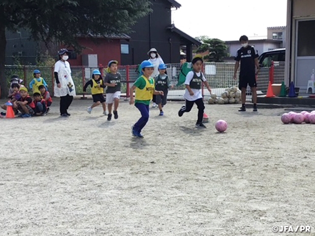 「巡回指導」では、各都道府県協会の巡回指導員が幼稚園や保育園、小学校に出向き、子どもたちにサッカーを楽しんでもらう各種プログラムを提供しています。サッカーの経験や知識があまりなく、なかなか自信を持って教えることができない保育士の皆さんや先生方に、サッカーの指導を専門とするスタッフが加わって、子どもたちがボールを使って体を動かす時間を設ける取り組みです。ここでは各地での巡回指導の様子をご紹介します。