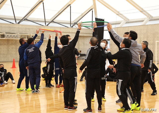 中山 キッズ年代のターゲットは幼児から小学4年生です。JFAではフットサルとの連携も進めていますから、フットサルをメインでやっている指導者にもフェスティバルに加わってもらい、フットサルを体験できるエリアを設けることも一つのアイデアです。フットサルでは、ローバウンドのフットサルボールを使いますので、それを体験できる場をつくれたら面白いですし、難しいとは思いますが、ビーチサッカーもそこで体験できたらまた面白い。高円宮記念JFA夢フィールドであれば、それが可能なんですけどね。そうやってさまざまなフットボールを体験してもらうことも、キッズ年代の子どもたちにとって有効ですので、各FAでもフットサル委員会と協力して実践してもらえたらと思っています。ほかにも、ブラインドサッカーで使用する音が鳴るボールを使うなど、各FAのキッズ担当者の皆さんにはいろいろなアイデアを出し合って楽しくフェスティバルをつくってもらいたいんです。