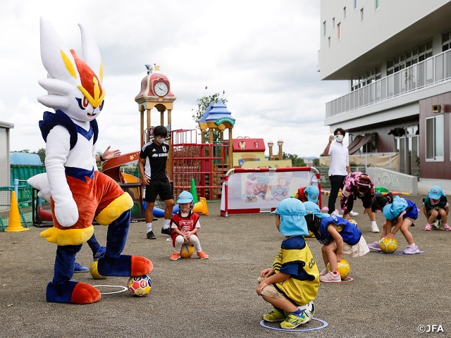 今年9月からは巡回指導先にJFAキッズアンバサダーのポケモン「エースバーン」仕様のボールと