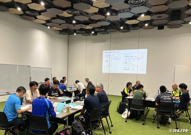 8月6日(日)、千葉市の海浜幕張公園内にある高円宮記念JFA夢フィールドにて、ウォーキングフットボールの場づくりを考える「ウォーキングフットボール コーディネーター講習会」を開催しました。今回は愛媛県、滋賀県、長野県、静岡県、群馬県など、遠方からも多くご参加いただき、常に積極的に学びかつ楽しもうとする姿勢が感じられる講習会となりました。グループに分けた交流タイムでは、既に場をつくっている方やこれから場をつくりたいという方の思いを共有したり、実技では、実際にプレーやピッチマネージャーを体験しながら、ウォーキングフットボールの楽しさを体感したりと、笑顔があふれる充実した時間となりました。