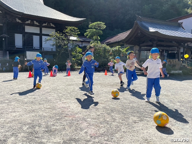 当日は天気も良く、朝から楽しみにしていました。普段の遊びの中でも、ゴールを出してサッカーを楽しむ子もいるので、当日もコーチの話を聞いて、身体を沢山動かして楽しみました!