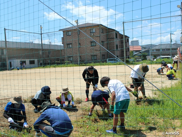 JFAグラスルーツ推進・賛同パートナー制度の「施設の確保」の賛同パートナーである「アレックスサッカースクール」(徳島県徳島市)が、8月12日(水)に、ジュニアユースの通常練習およびジュニアの特別練習で使用している沖洲グランドの清掃活動を、選手・保護者・指導者・地域の方、計22名で行いました。