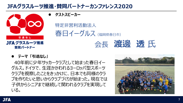 春日イーグルスはクラブ設立から40年。ヨーロッパ型の総合型クラブを目指し、地域の人達が継続してサッカーやスポーツが楽しめるように、自治体の協力を得ながらクラブを運営されています。子供からシニアまで継続でき、外に出てもまた戻って来られる、みんなの居場所づくりための貴重な話を渡邊会長が語られました。