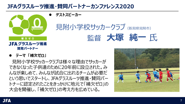 新潟県の中央に位置する見附市にある見附小学校サッカークラブは、何らかの理由で試合に出られなかったり、サッカーを続けられなくなったり、そんな子供たちのために20年前に設立されました。グラスルーツ推進・賛同パートナーになったことをきっかけに、「補欠ゼロ」の大会を地元で開催され、「補欠ゼロ」をベースとした理念を地域に広げられています。取り組みを通じてグラスルーツの大事さを熱くお話いただきました。
