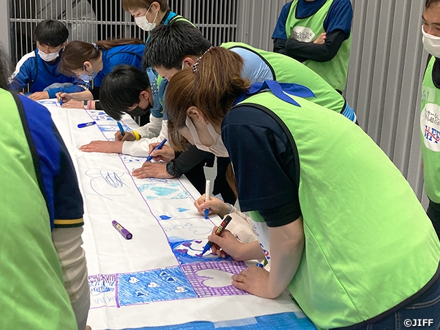 公益財団法人日本サッカー協会(JFA)社会貢献委員長でアーティストの日比野克彦さんが、白い布に下絵を描き、参加者が青いフラッグを完成。ひとつのものをみんなで作り上げることで、より一体感が生まれました。