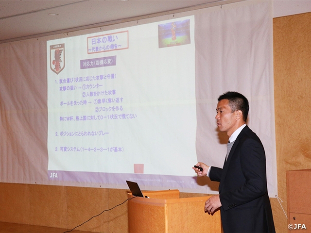 研修会は2部構成で行われ、試合前の1部講義では、アンダーカテゴリーの世界大会の分析からこの年代での世界のトップレベルのプレーを映像で共有し、日本の選手たちが身につけるべき攻守の課題の確認を行いました。また、今年開催されたFIFAワールドカップロシアを題材に世界トップのトレンドについても説明がなされました。試合終了後には2部講義として、当日の審判団、そして太田潔JFA審判インストラクターを招き、「技術と審判の協調」をテーマに受講者とディスカッションを行いました。直前に行われた試合のなかで起こった事象について、映像を交えながら、スタンドからの意見、もし当該チームの指導者だったらどう考えるかなどを受講者が発言し、それを受けて、審判団からの意見を聞くというスタイルで活発な意見交換がなされました。1部、2部とそれぞれ同じカテゴリーを対象としながらも、異なった視点での講義となり、非常に有意義な研修会となりました。