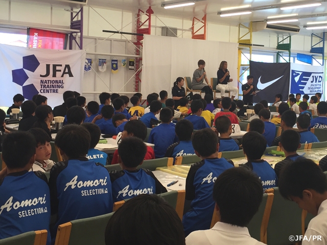3日目には、選手を対象に、元日本代表の北澤豪さんと元なでしこジャパンの永里亜沙乃さんにお越しいただき、夢を実現するためのアドバイスや小学生の頃にどんなことに取り組んでいたかなど、普段聞くことのできない貴重なお話をしていただきました。選手たちはたくさんの質問をすることができ、有意義な時間となりました。