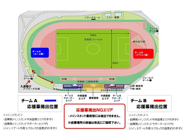 上記チームの応援バナーは、アウェイ側メインスタンド中央座席エリア及びサポーターエリア(メイン3ゲート外側3ブロックの座席)内の手すりに掲出可能です。