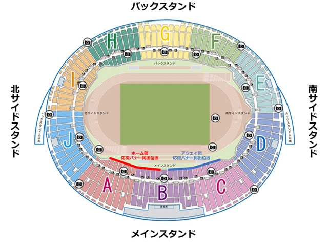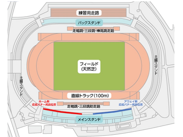 ※メインスタンド最前列については、運営本部、選手ロッカー等に被る長さの物は不可。その他エリア内であっても掲出不可の場所もございますので、お近くの係員の指示に従ってください。