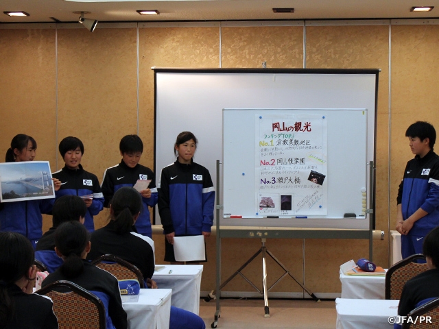 また、オフザピッチでは、事前に与えられた「岡山県の歴史」「岡山県の食文化」など岡山県に関する課題をグループでまとめ、発表を行いました。