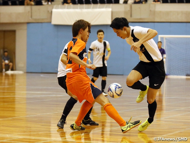 JFA第15回全日本大学フットサル大会が23日(金)、大阪府の岸和田市総合体育館で開幕しました。初日は1回戦の4試合が開催され、ベスト8進出チームが出そろいました。全12チームのうち、サッカー部は3チームが出場していましたが全て敗退し、普段からフットサルをプレーしているチームがベスト8に駒を進めました。