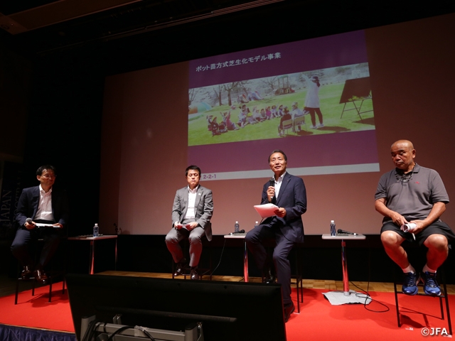続いて話し合われたハード面では、来春完成予定のJFA夢フィールドが好例となりました。サッカー界が目指す環境づくりの象徴であるとともに、先日の植え付けで使われたポット苗方式の芝生化が広がりをみせそうです。ポットの中で1カ月ほど育てた苗を50cm間隔で植え付けていくという簡単な方法で、それだけに効率も抜群であることが、松崎JFA施設委員長から報告されました。プラスチックを扱う企業として始まったアイリスオーヤマは、これまでのノウハウを人工芝に応用しようとしています。日本の課題に向き合う「ソリューション」(解決)というテーマの柱にスポーツ事業を据え、地域に密着しながらスポーツをする人や観る人が快適になる環境を提供することで、今後も同社らしく地域社会に貢献し、課題解決に取り組んでいくとのことでした。