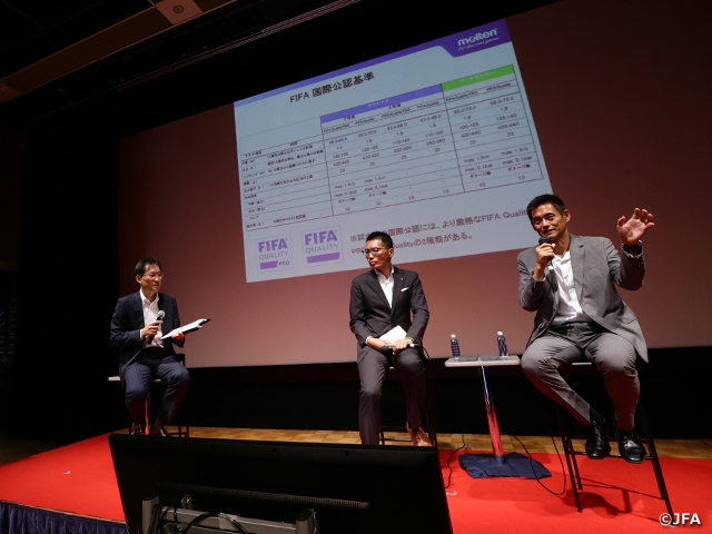 無くてはならないものであるのに、普段はあまり語られない「ボール」をテーマにしたセッションが行われました。GKとして活躍をされていた元日本代表GK川口氏は、随分とボールの進化に戸惑ったと明かして、会場を笑わせました。それに恐縮していたモルテンの椙浦氏ですが、「いろいろな現場の声をいただきながら改善してきました」と、選手の視線を大事にしてきたことを強調していました。熱接合という技術で縫い目がなくなったこと、ボールを構成するパネルの枚数の増減など、よりよいボールを提供しようとするメーカーの思いに、指導者に転じた川口氏も熱心に耳を傾けていました。