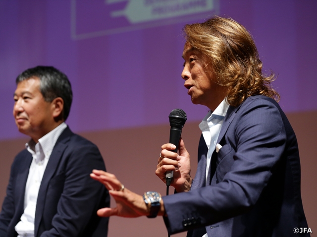 選手にとって重要なフィジカルやメディカル面について、トレーナーとして長く日本代表に携わる前田氏や、フィジカルフィットネスプロジェクトの山口氏が現状や将来像を述べました。時代が進むにつれ、体のケアなどサッカー選手の意識はどんどん高くなっているそうです。明治では「次世代の体づくりのサポート」をテーマに、サプリメントの提供に加えて、全国各地で栄養講習会を行い、年間約10万人に「365日×3回の食事をチャンスに変える」為の食事や補食、その摂取タイミングの重要性を広めています。ニチバンからも次世代トレーナーの育成を目的に、JFAと実施している「サッカーメディカルキャンプ」を例に、企業とJFAの共創について紹介されました。