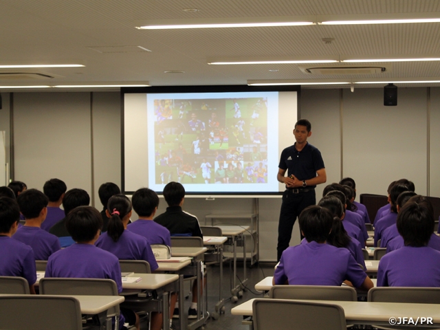 U-15日本女子選抜トレーニングキャンプ1日目は、加藤賢二監督のレクチャーでスタートし、このキャンプの目的を確認しました。その後ピッチに移動し、フィジカル測定を行いました。選手たちは集合時、緊張の面持ちでしたが、ウォーミングアップをみんなで行っているうちに、緊張が解け、笑顔が見られるようになりました。測定は4種目行い、測定の最後の種目であるYo-Yoテストでは、お互いに応援し合いながら自己ベストに挑戦する姿が見られました。その後、フィジカルプロジェクトの広瀬コーチから、チームに戻ってから取り組むトレーニングの紹介があり、選手たちはお互いのフォームを見合いながら真剣に取り組んでいました。夕食後も広瀬コーチからなでしこジャパンの選手のトレーニングに対する取り組みなどの話を聞き、一人一人意識が高まったように感じました。明日からの本格的なトレーニングに向け、心も体も十分に準備を整えることができました。