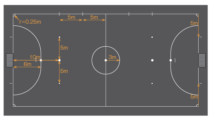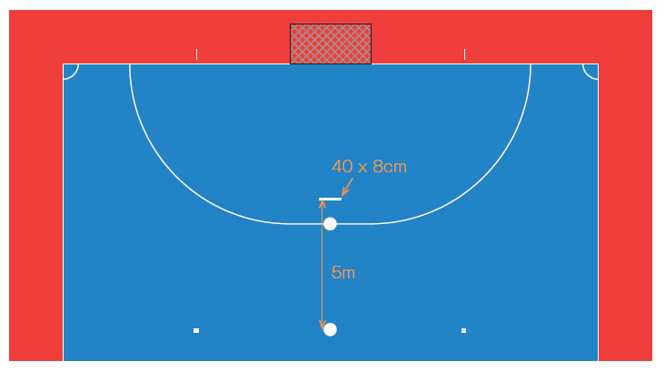 ペナルティーエリア内の5mマークは、6つ目以降の累積ファウルに与えられる直接フリーキック(DFKSAF)が行われるとき、ゴールキーパーが離れることができる距離を示したものである。その位置は、5mマークの最も外側(つまり、ゴールラインに近い側)から10mマークの中心まで計測されたところとなる。