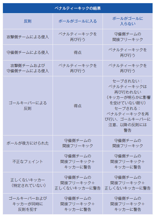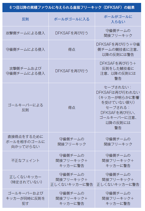 →ボールがゴールに入らなかった場合、キックは、再び行われる。反則した競技者はその試合において最初の反則については注意が与えられ、それ以降の反則には警告が与えられる。
